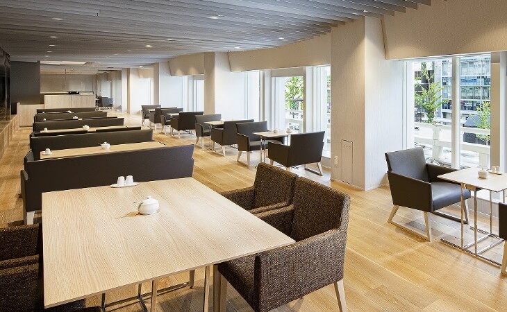 御堂筋沿いにある、木を基調とした開放的なラウンジカフェ。